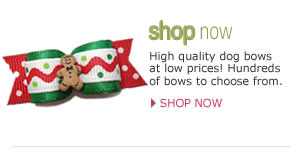 Just one click to "SHOP NOW" will show dog bows galore... one of the best dog bows selections around ... unique dog bows, fun dog bows, fancy dog bows, designer dog bows, birthday dog bows, sports dog bows, Valentine's dog bows, St Patrick's Day dog bows, Christmas dog bows, holiday dog bows, retro dog bows, patriotic/July 4 dog bows, spring dog bows, Easter dog bows, Halloween dog bows, fall dog bows, girl dog bows and boy dog bows, silver dog bows and gold dog bows, gorgeous dog bows and beautiful dog bows, boutique dog bows, korker dog bows, show dog bows, diva dog bows, pom-pom dog bows, rhinestone dog bows, tiny dog bows, cool dog bows, special dog bows & every day dog bows, dog bows with sparkle & sparkly dog bows... tons of perfect dog bows galore! - you'll find them all at BowBiz.